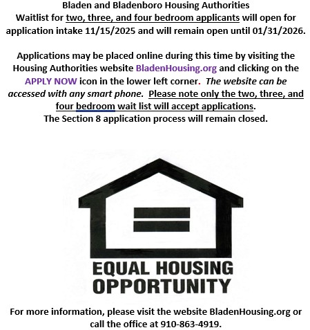 Bladen and Bladenboro Housing Authorities' Waitlist for two, three, and four-bedroom applicants will open for application intake on 11/15/2025 and will remain open until 01/31/2026.